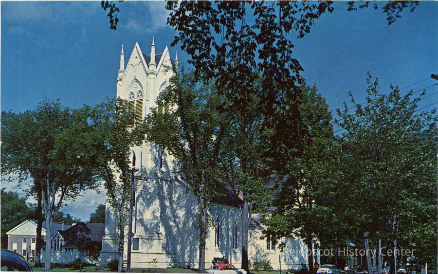 A colored picture postcard of the First Parish Church, Maine Street, Brunswick. Undated
