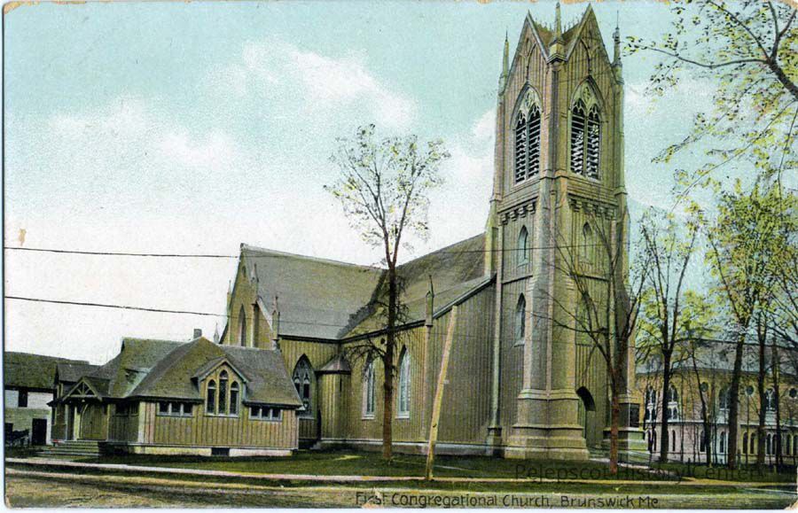 An undated color postcard of the First Parish Church in Brunswick, Maine.Collection