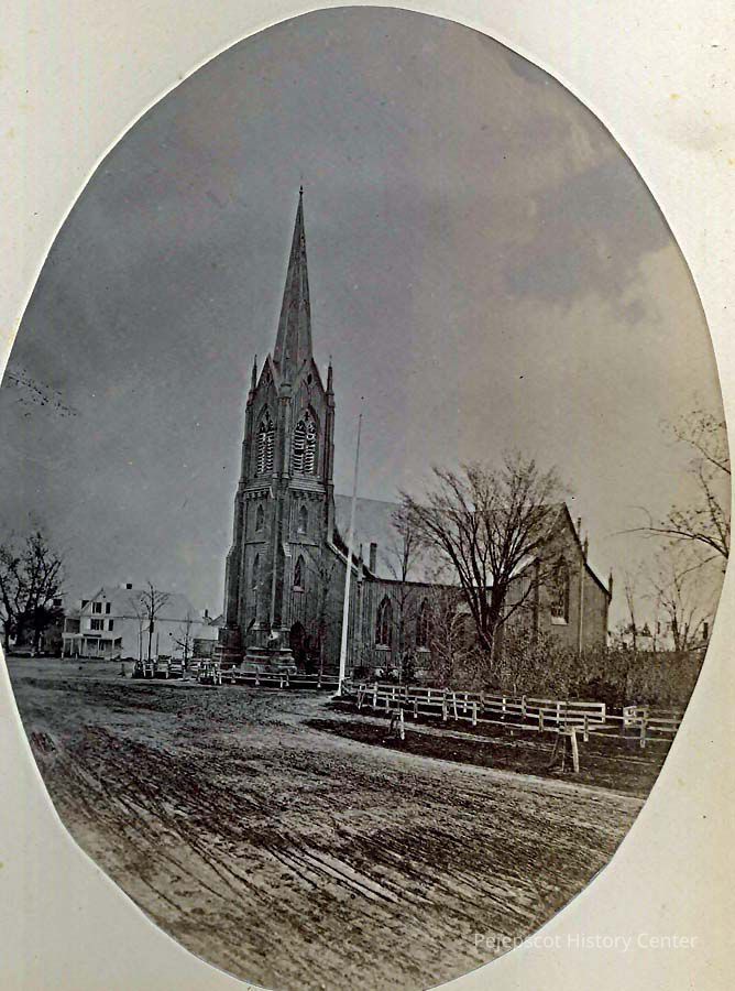 A B/W photograph of the First Parish Church while it still had the original steeple. The original steeple blew over in a storm right after the Civil War. Undated.