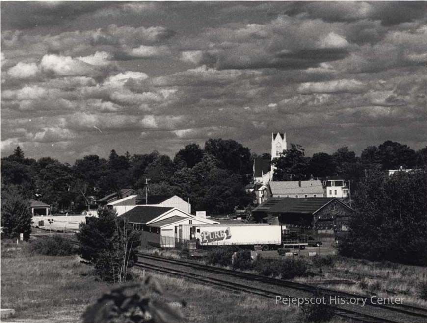 A B/W photograph of the First Parish Church as seen from a distance. Undated
