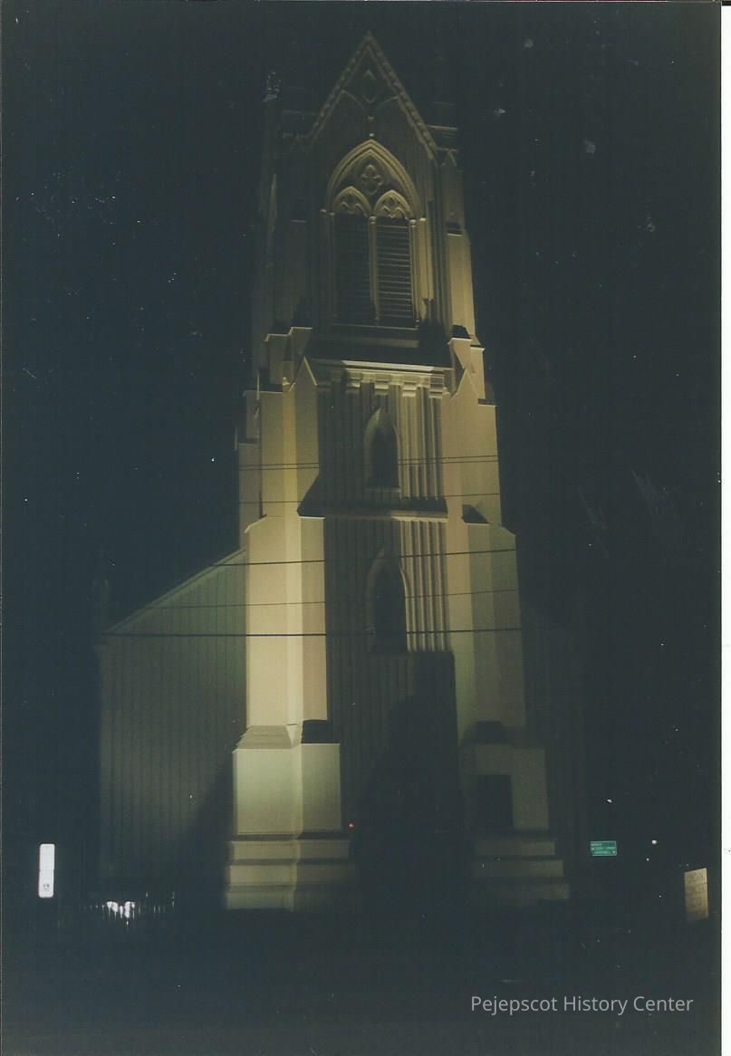 A color photograph of the First Parish Church (Brunswick, ME) taken at night. Dated Fall, 2004.