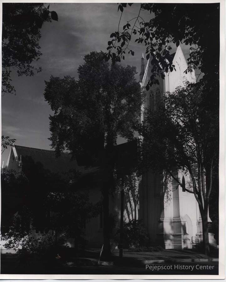 Photo of First Parish Church, Brunswick, Maine. Note large elm trees in front.