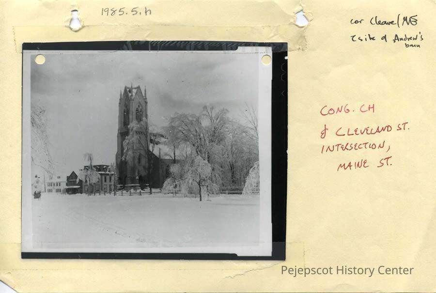 An undated black and white photo of the First Parish Church at the intersection of Maine and Cleaveland Streets, Brunswick. Notes on the page indicate the church is Congregational, and that the corner of Maine and Cleaveland Streets was the "site of Andrew's barn."
