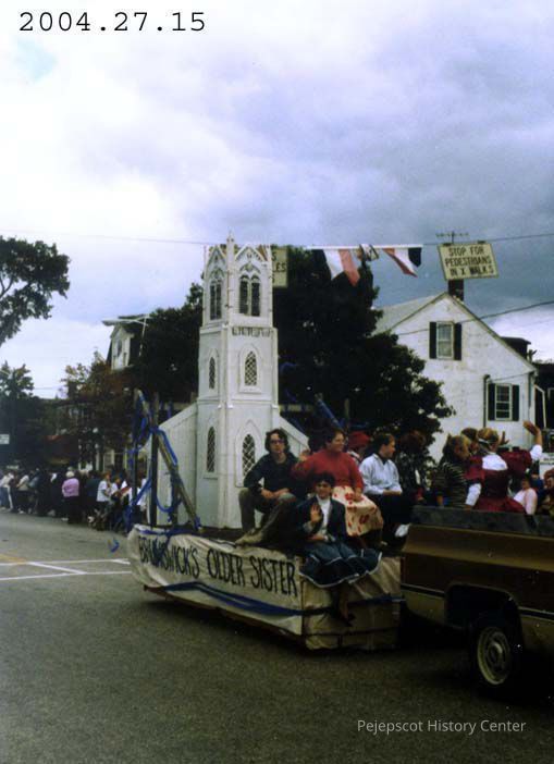 A color photograph of Brunswick's 250th Anniversary Parade (Oct 1989) showing the First Parish Church Float. One of three different views (.15, .16, .17).