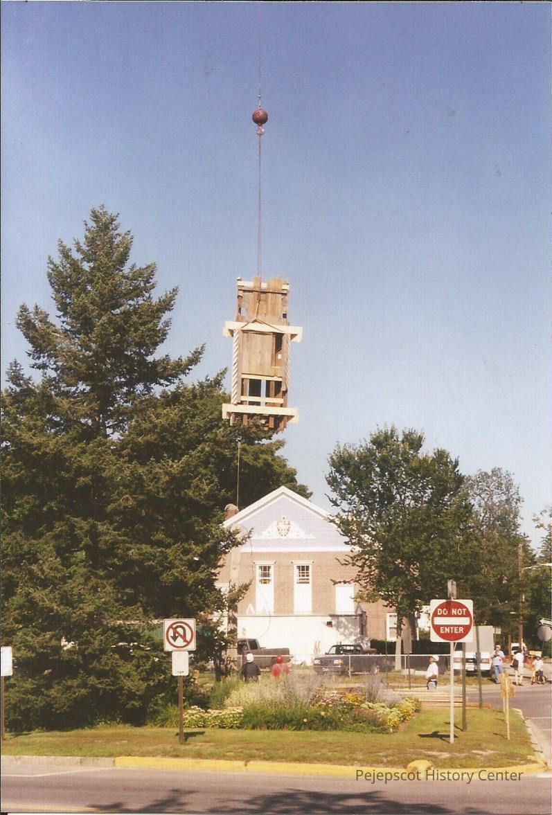 A color photograph of a part of the new steeple being lifted during restoration of the First Parish Church, Brunswick, ME. Undated.