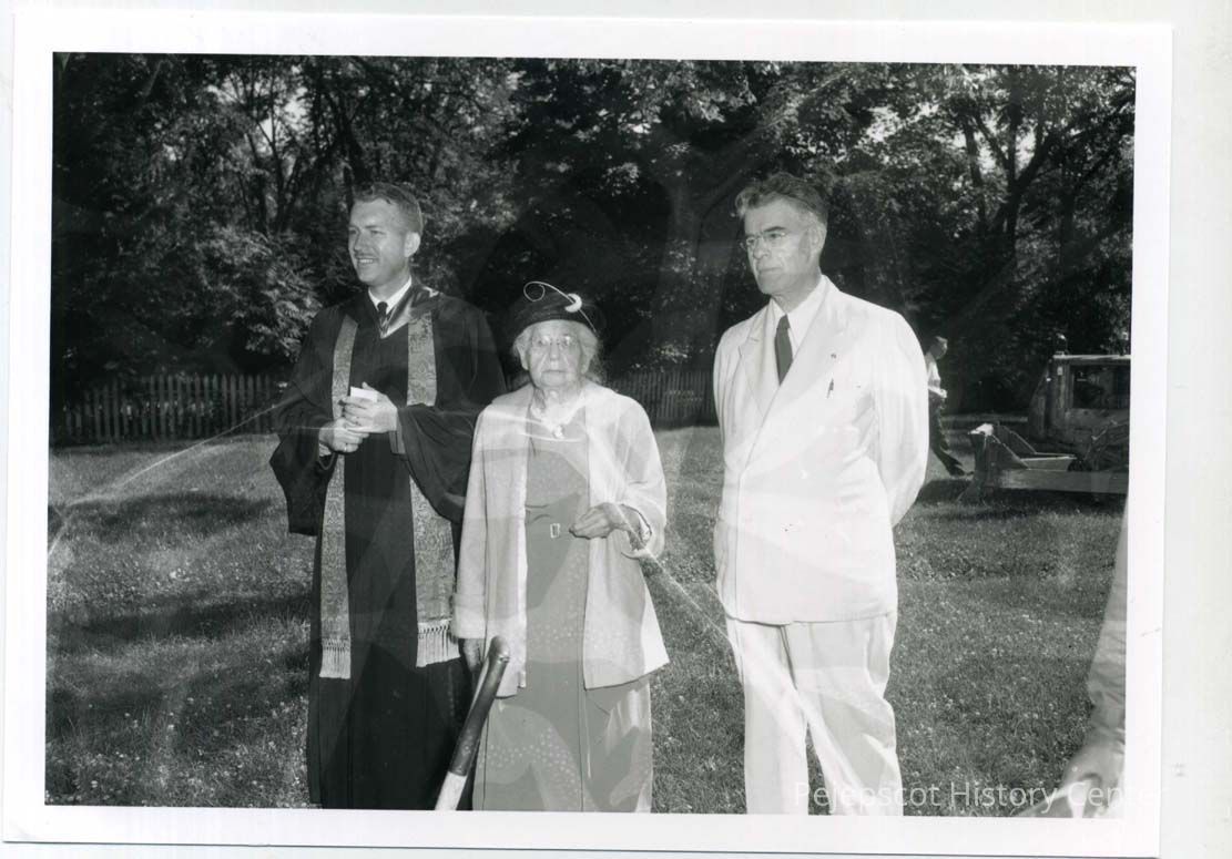 The Rev. J. Arthur Samuelson, pastor of the First Parish Church, stands beside Mrs. Francis Woodside 88 ( the oldest retired Deaconess). On her other side is Clement F. Robinson.