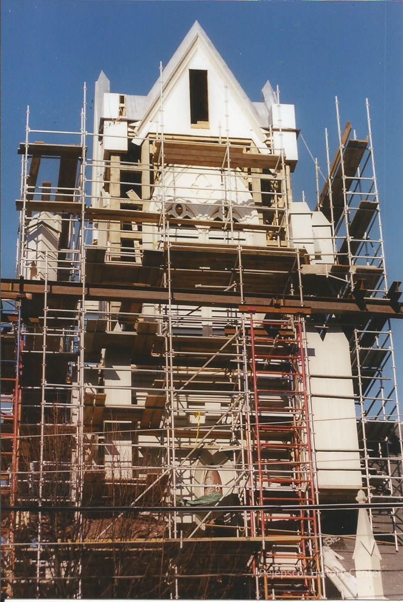 A color photograph of the First Parish Church (Brunswick, ME) with staging around the Steeple. On the back is written "Congregational Church, Brunswick," and the date which has been crossed out. Dated 05/31/2003.