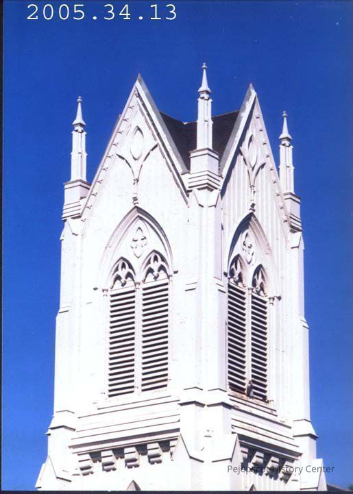 A color photograph of the First Parish Church Steeple. Similar to 2005.34.12 but at a slight angle. See 2005.34.13.a for negative.