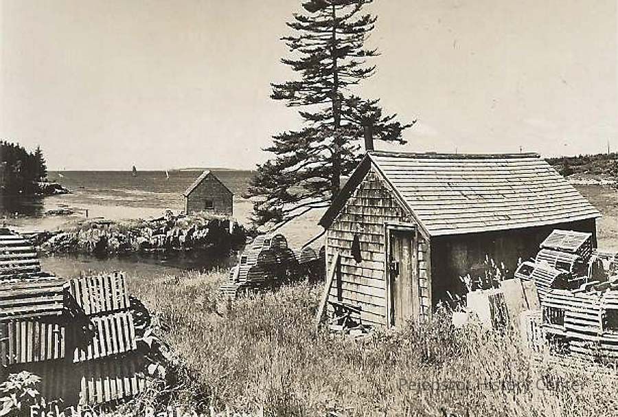 A B/W photograph of the fish houses at Bailey Island. Undated
