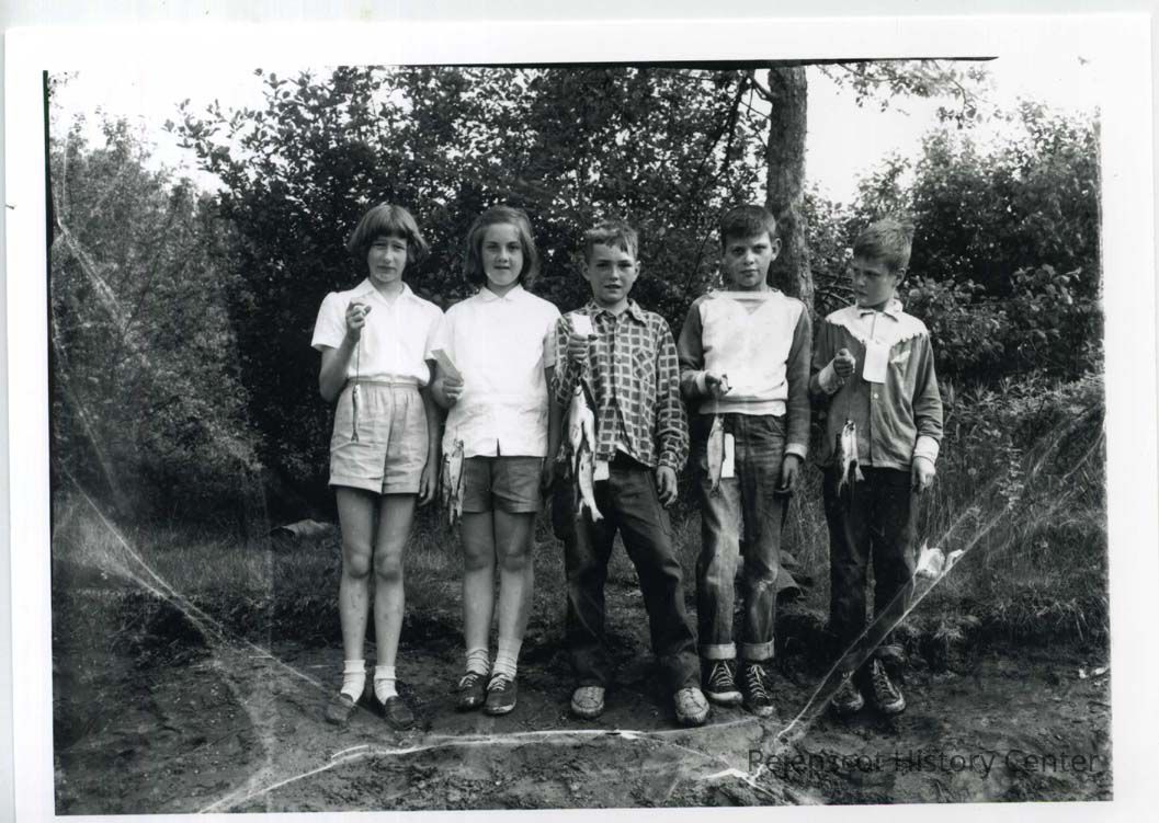 Four children involved in the Fishing Derby pose with their catch. The first girl is Janice Gordon and the first boy is Teddy Young.