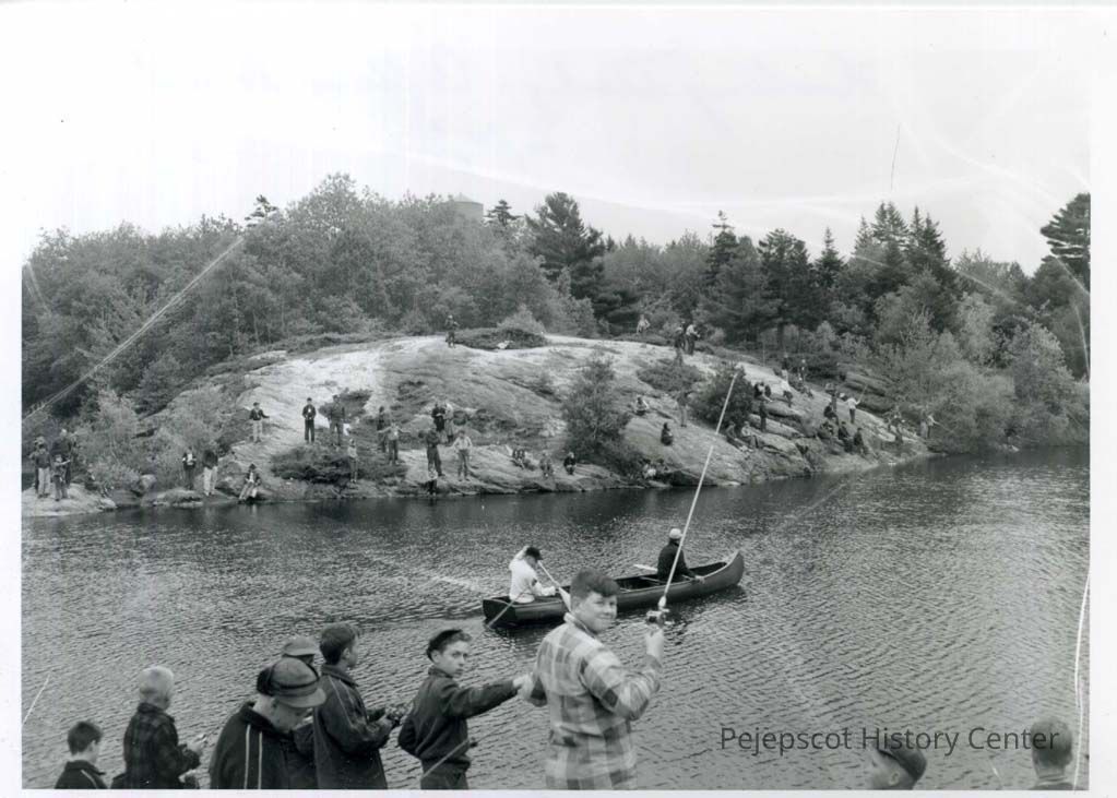 Men and boys fish at Coffin Pond during the Fishing Derby on June 11, 1956.