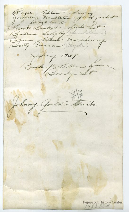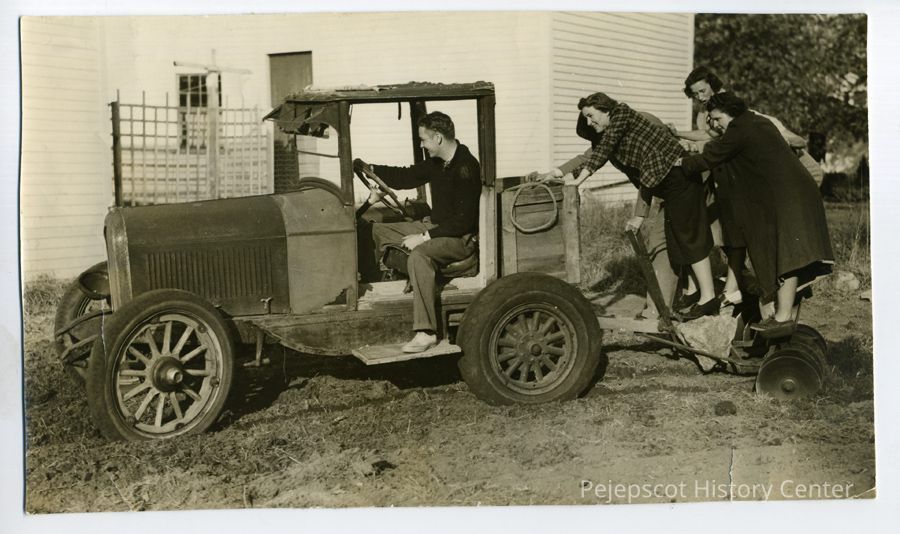 Five people posing on or pushing an old truck owned by John ("Johnny") Gould. The truck is possibly stuck in the mud. Driver: Roger Allen; Josephine Hamilton in plaid jacket; Frank Barker, dark hat; back row, probably front to back: Beatrice Sedgley (later Sandelin), Irma Allen with her "can showing," and Betty Courson (later Hyde). Taken in the spring of 1939 in back of the Allen house on Boody Street.