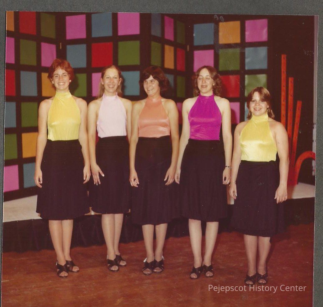 Contestants 5 to 9 Kathleen Jarrell, Stacy Pettigrew, Paulette Racine, Heidi Heintz and Barbara Morgan in opening number costumes.Collection