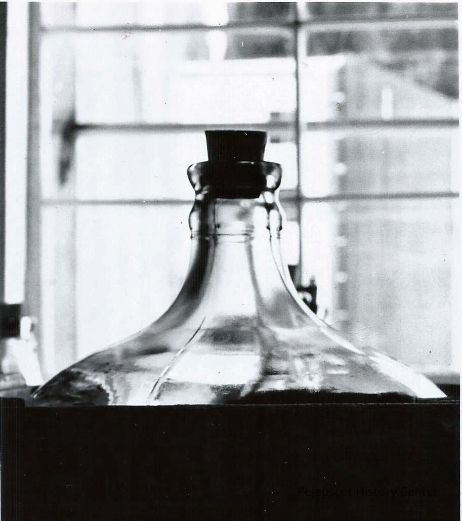 A b/w photograph of the top of a five gallon carboy with a cork stopper in it. Undated