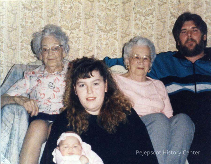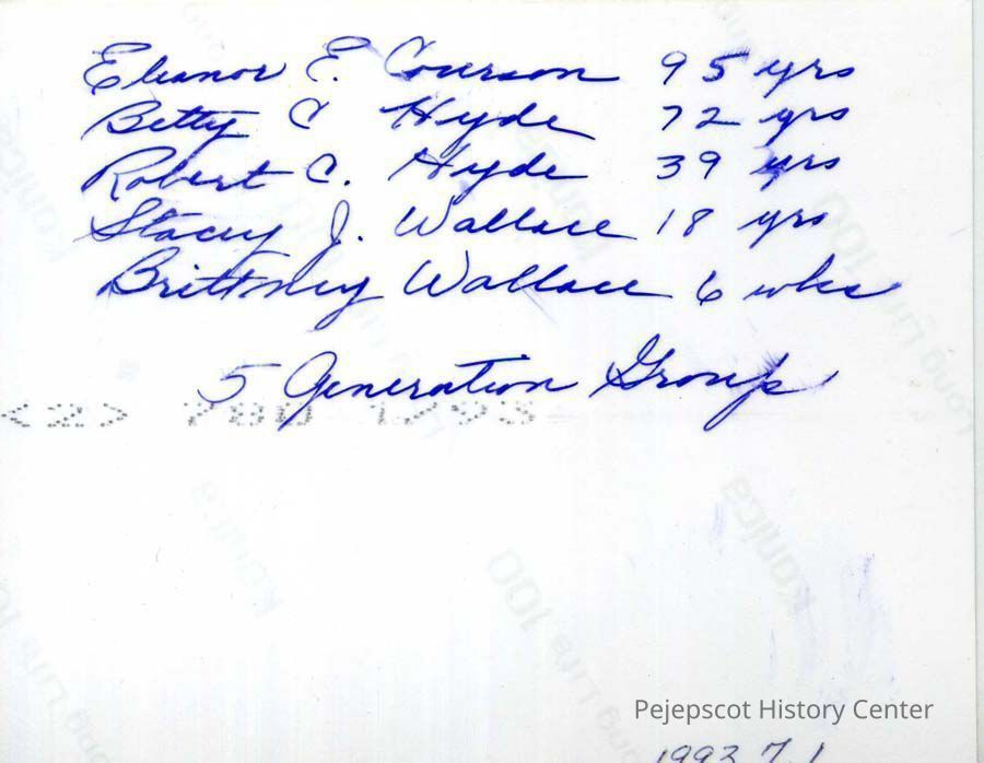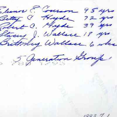 A photo of five generations of the Courson/Hyde family. They are: Eleanor E. Courson, 95 years old; Betty C. Hyde, 72 years old; Robert C. Hyde, 39 years old; Stacy J. Wallace, 18 years old; and Brittney Wallace, six weeks old. January 1993