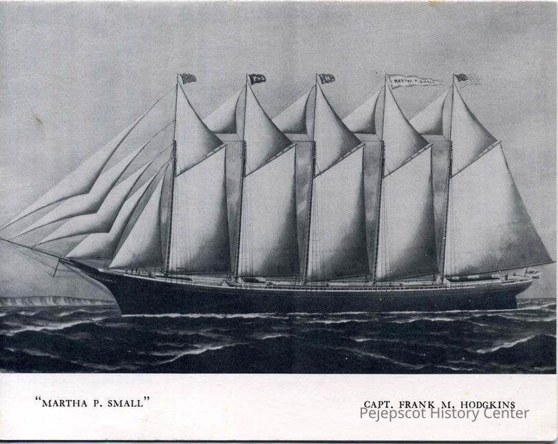 An undated black and white postcard showing a picture of the five-masted schooner "Martha P. Small", 2178 tons, built in 1901 by the shipyard Percy & Small, Bath, Maine. Included on the postcard is the name of the schooner's Captain, Frank M. Hodgkins.Lexicon