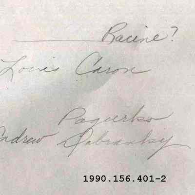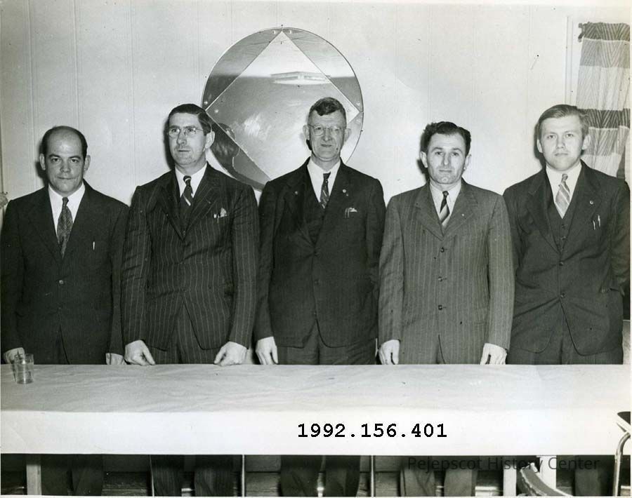 A B/W photograph of five men standing behind a table. Left to right: ? Racine; Louis Caron; ?; ? Pagurko; Andrew Dobransky . Undated