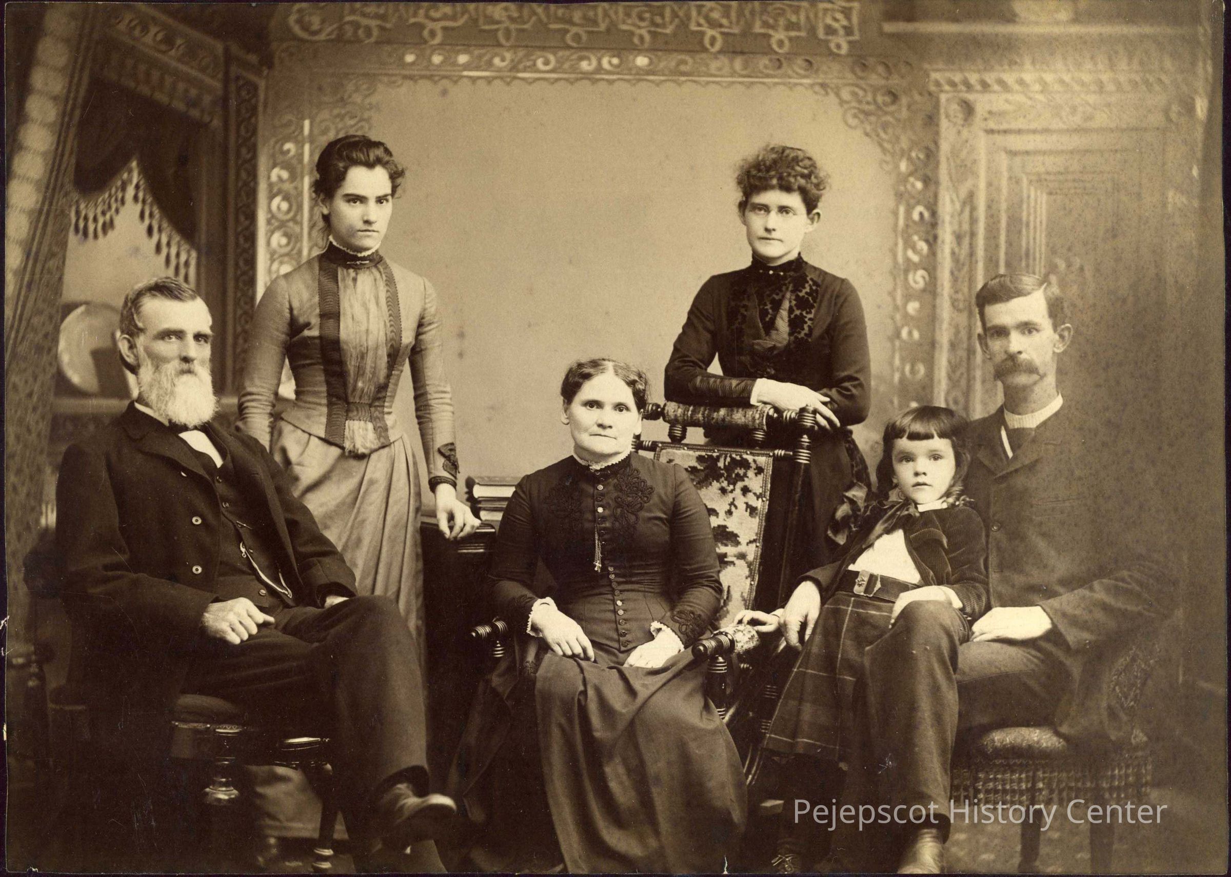 A B/W photo of five Petersons.They are with no refernce which one they are in the photo; John Peterson Mrs. John Peterson William A. Peterson Mrs. William Peterson John A. Peterson. The little girl is not named.