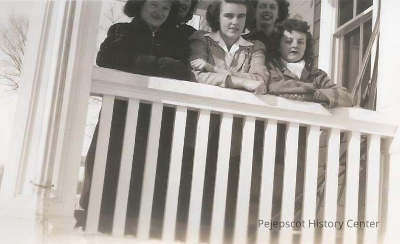 A B/W photograph of five unidentified women on a porch. Undated