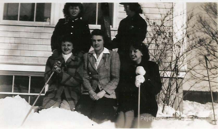 A B/W photograph of a group of five unidentified women sitting in the snow. Undated