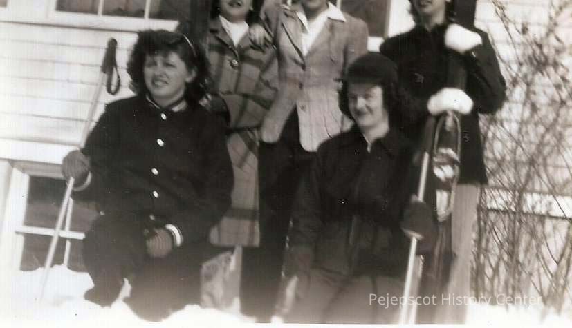 A B/W photograph of five unidentified women, some with ski equipment. Undated