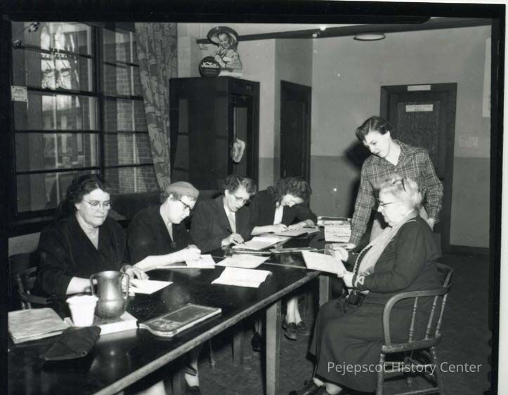 Five women sit at a table while one stands in a room at the Brunswick Recreation Center on Federal Street. negative made