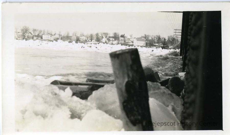 A black and white photo looking across to Topsham, Maine from a railroad trestle during the 1936 flood.