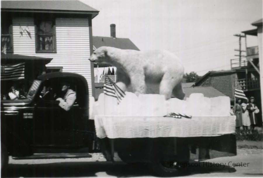A B/W photograph of a float of the Bowdoin College Polar Bear in the Bicentennial Parade . Marked on the back, "Don Lancaster." Undated