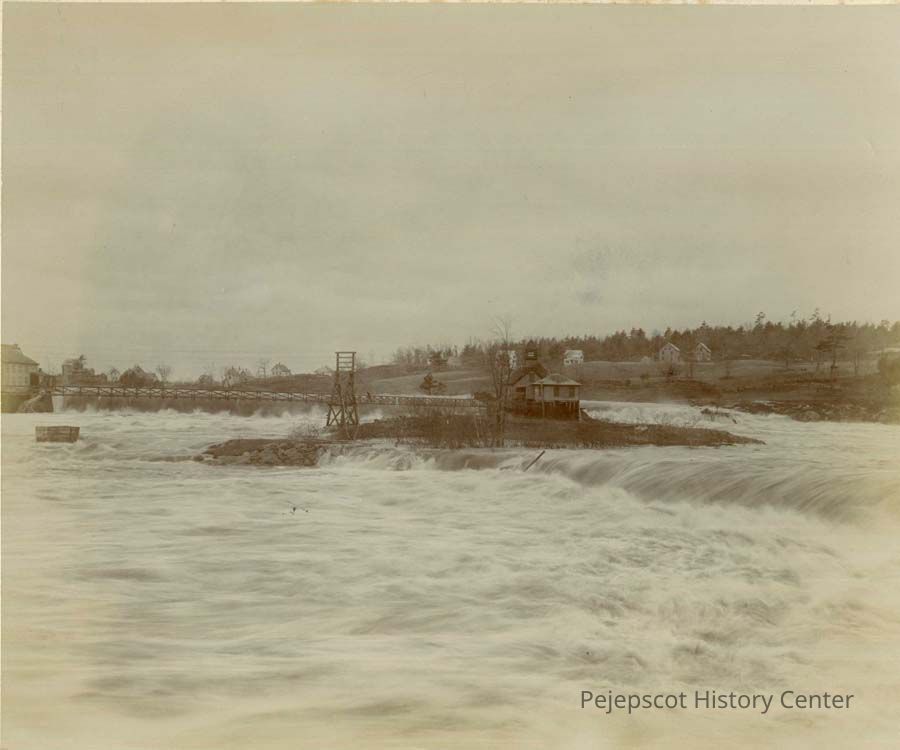 B/W photo of the 1895 Flood, showing the foot bridge and falls. Dated 4/16/1895.