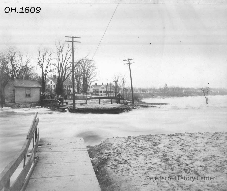 A B/W photographic view looking from near Red Mill on the Island, toward end of Green Street, Topsham, ME where the bridge has swept away during the Great Freshet of March 2, 1896.
