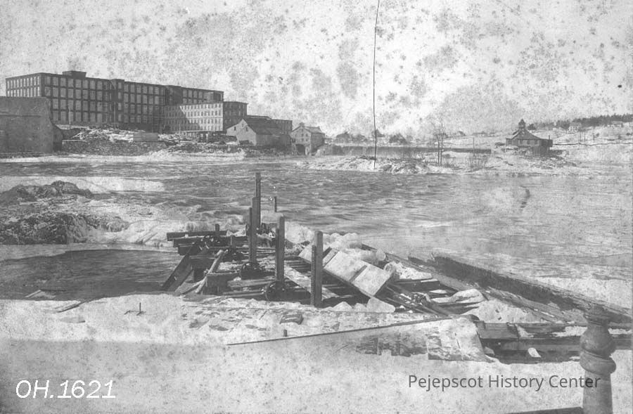 A B/W photograph of the Great Freshet - March 2, 1896 - Paper Mill, Power Station, Bridge on the Androscoggin River with lower dams washed out in the Flood. Photo shows Cabot Mill on left shore, head gates of Paper Mill in foreground, old Electric Power Station on right in background, and bridge to Electric Power Station was swept away.