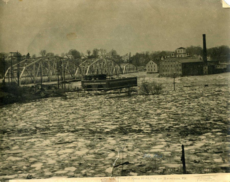 Flood of March 14-20, 1936, showing Bowdoin Paper Mill and bridge.