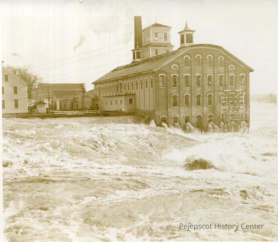 B/W photo of the Pejepscot Paper Co. Mill, Topsham, ME, during the flood of 1936. 1936.