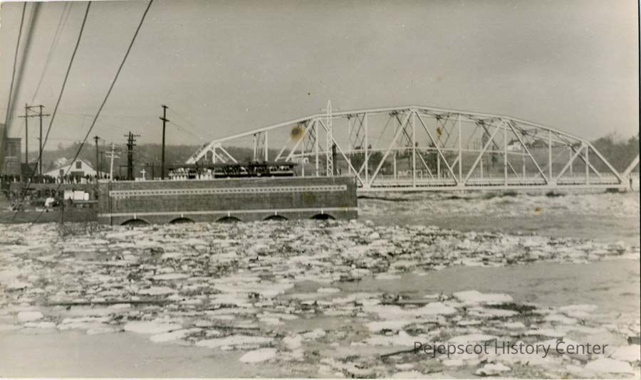 A B/W photograph of the 1936 flood on the Androscoggin River. The Frank S. Wood Bridge and the electrical generating station can be seen. 1936