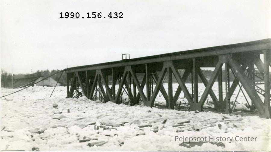 A B/W photograph of the1936 Flood taking out the railroad trestle. Undated