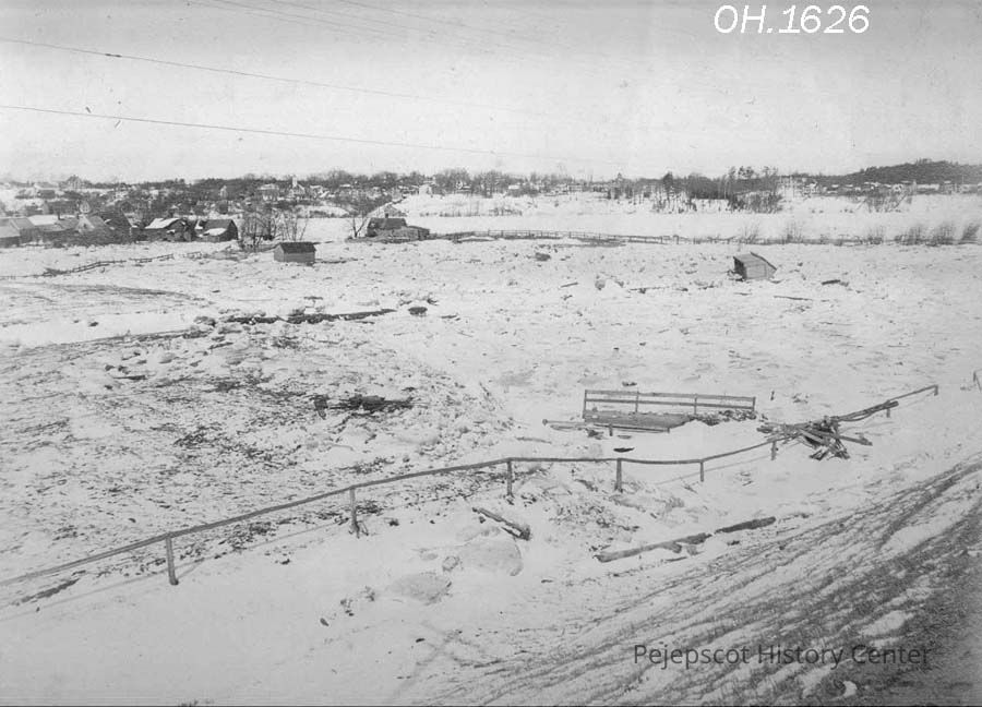 A B/W photographic view from the Maine Central Railroad after the flood/freshet after March 2, 1896, looking towards Androscoggin River and Topsham, ME. Duplicate of OH 1613.
