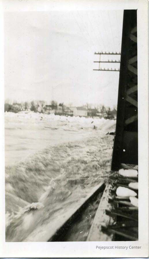 A black and white photo of an unidentified bridge during the flood of 1936. Looking towards Topsham, Maine.