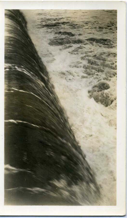 A black and white photo of the falls at the back of the mill during the 1936 flood.