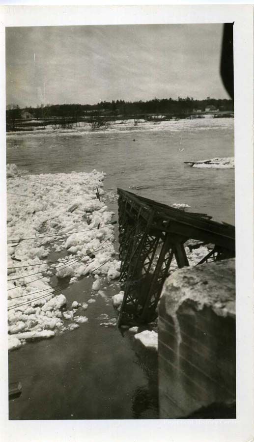 A black and white photo of the partially under water railroad trestle during the 1936 flood.