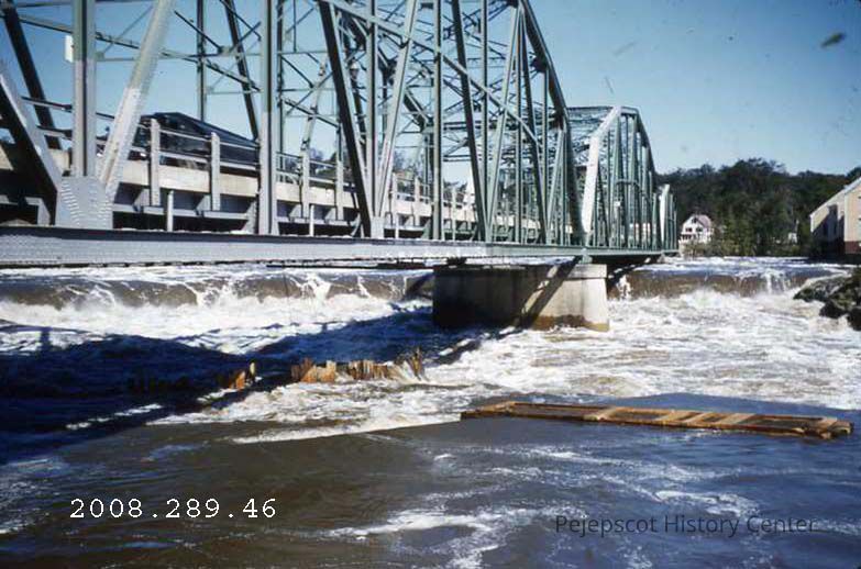 A color slide of flood waters going under the Frank J. Wood Bridge. The photo was taken from the Brunswick side. Undated