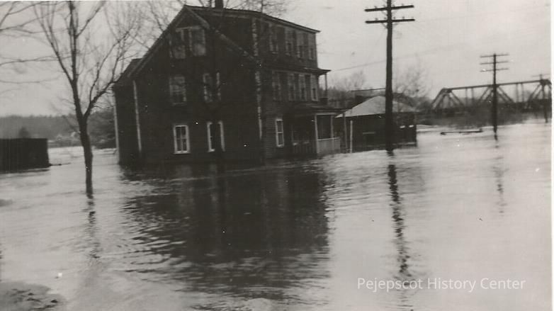 A B/W photograph of the flood on Mill Street, Brunswick, ME. The house is submerged, while the Black Bridge is visible in the background. See 2020.23.25. Undated, but possibly fallout from the 1936 flood.Lexicon