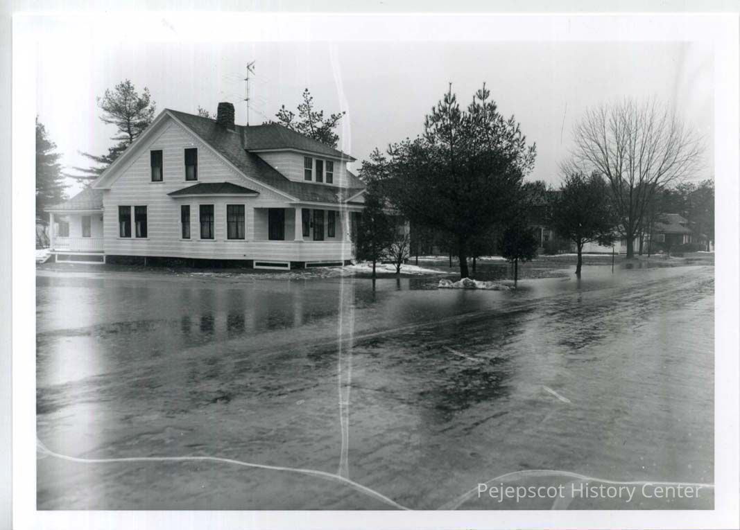 This photo, looking from Harpswell Street down Longfellow Ave,shows water on the street and the lawns of homes in March 1954.