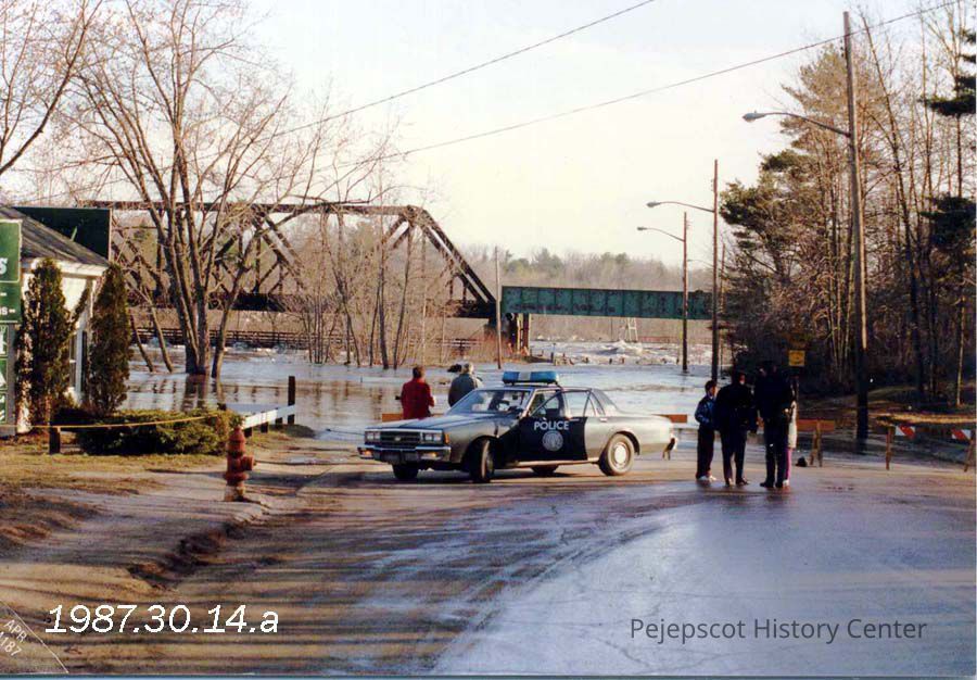 A color photograph of Brunswick; 5:45 AM, on April 2, 1987. The people of the Town of Brunswick, Maine awoke this day to find Mill St. impassable.