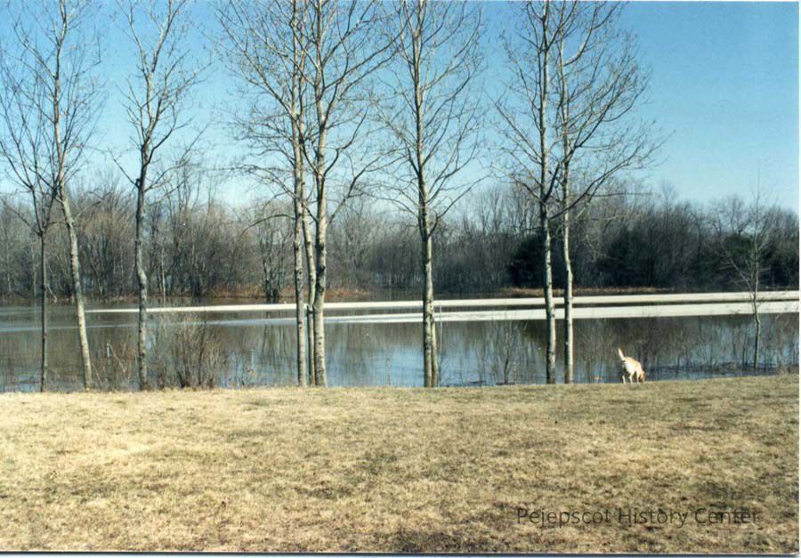 A color photo of a dog near the water during the April 1987 Flood. Photo was taken near I-95. Brunswick, Maine.