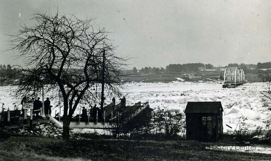 A B/W photograph of the shoreline plus ice and an unknown bridge during the 1936 flood.