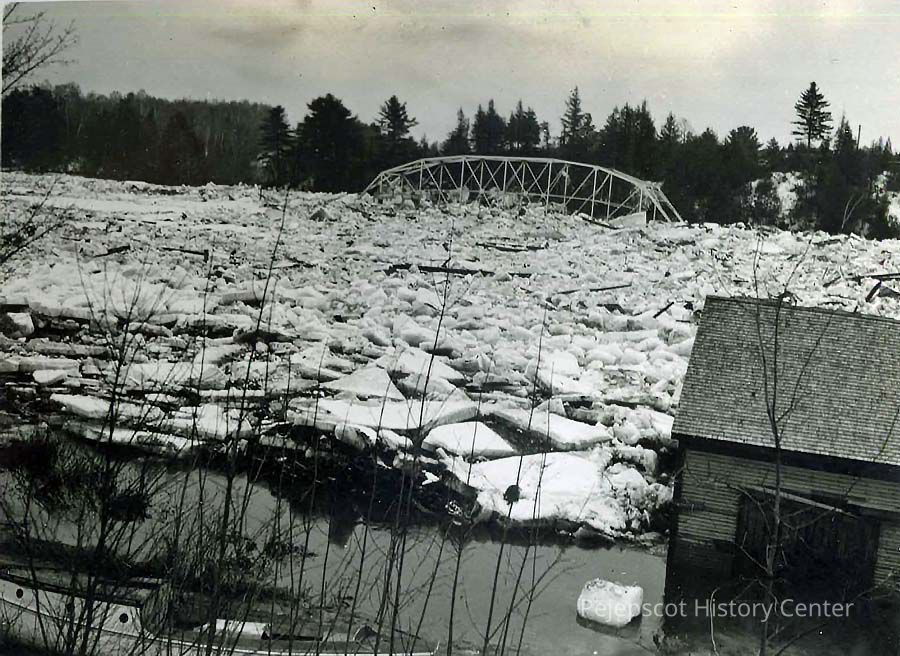 A B/W photograph of the ice and a damaged bridge and building in the Androscoggin River during the 1936 flood.