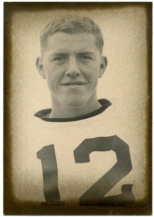 Photo of a young football player with the number 12 on his uniform. The back reads "Turner, NEW NO.=65, Sept, 1963.