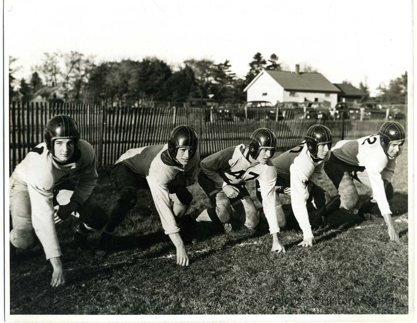 Five football players lined up on Edwards Field (1945-47) in a crouching position. From left to right they are; Dick Morrell, ? Lord, Henry Baribeau, George Tetu, Rene Belanger. Undated