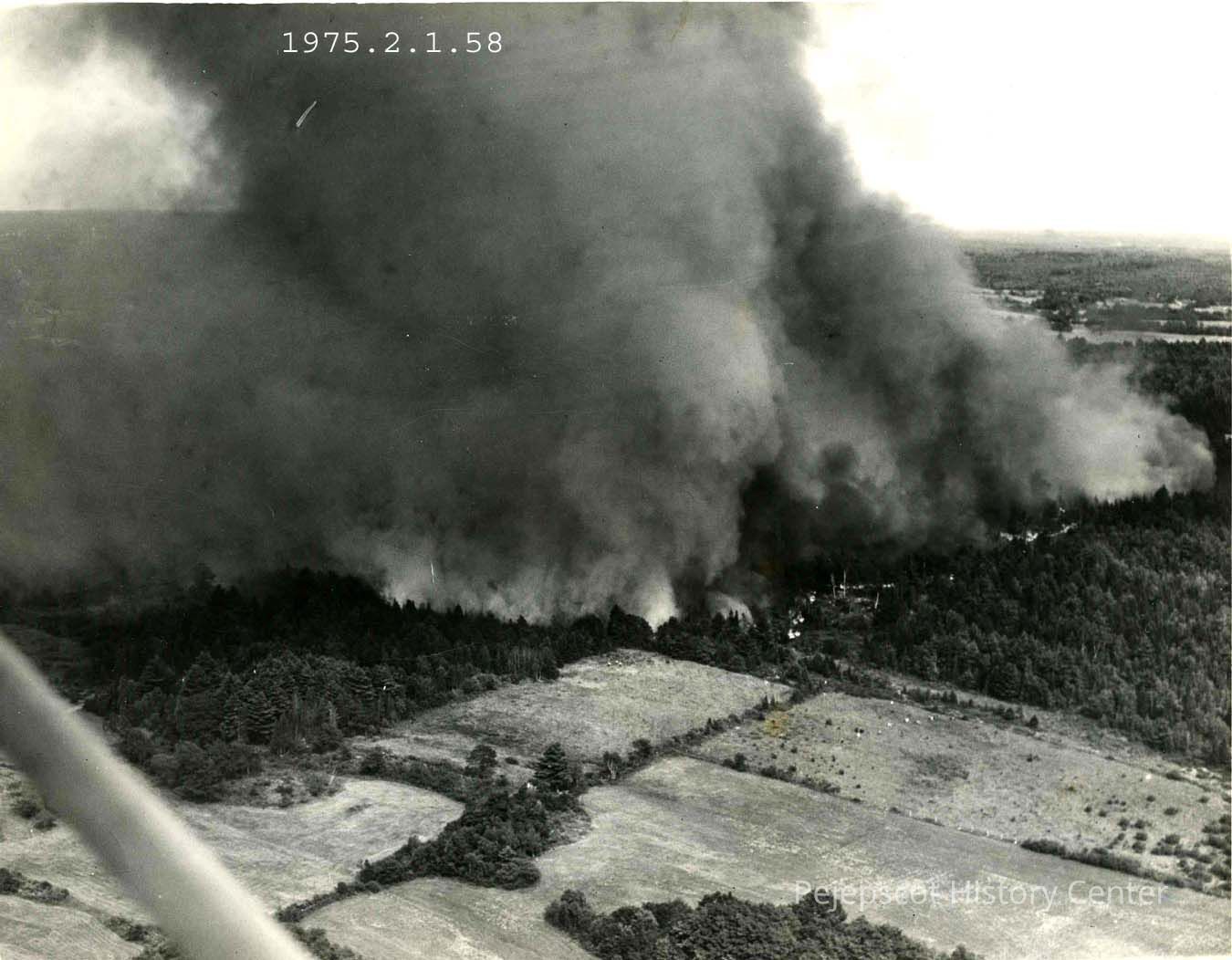 A black & white aerial photograph of a forest fire in West Bath, ME. Dated July 5, 1953.