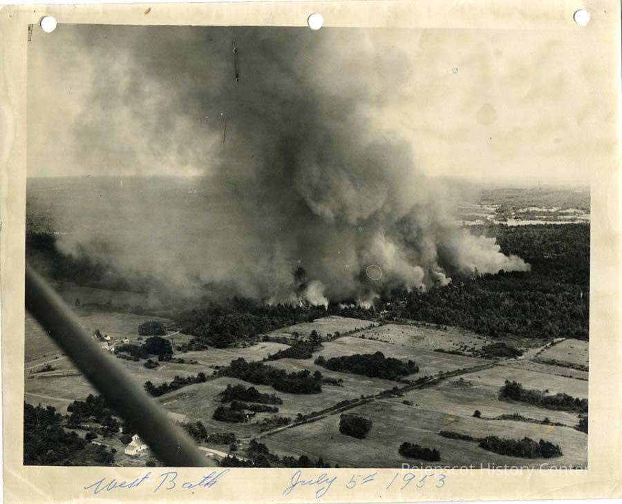 A black & white aerial photograph of a large forest fire in West Bath, ME. Dated July 5, 1953.